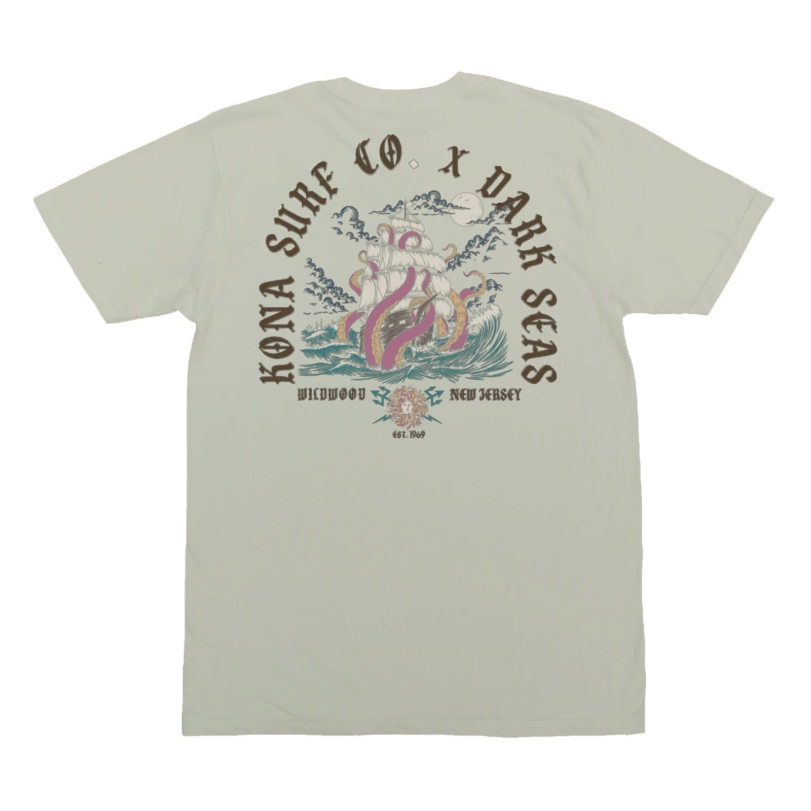 Dark Seas x Kona Surf Co. collab features a sunken ship tangled in tentacles, moving through a dark, unsettled sea. The design pulls from Dark Seas maritime influence and working-ocean background, paired with Kona Surf Co. sun-and-trident logos and its cold-water surf heritage in New Jersey.