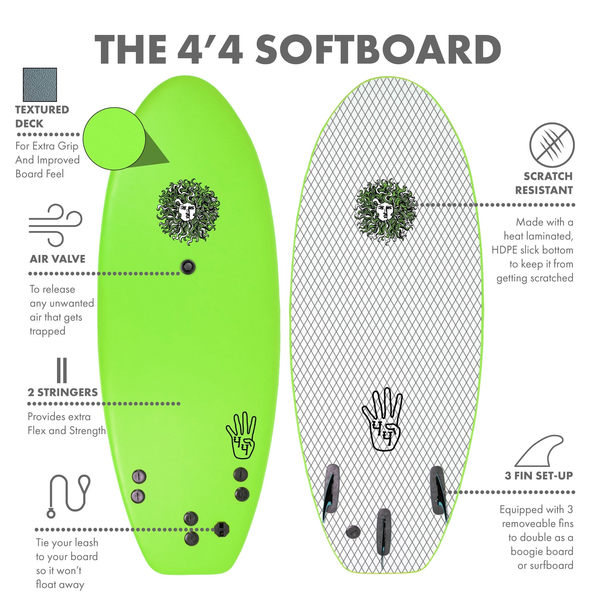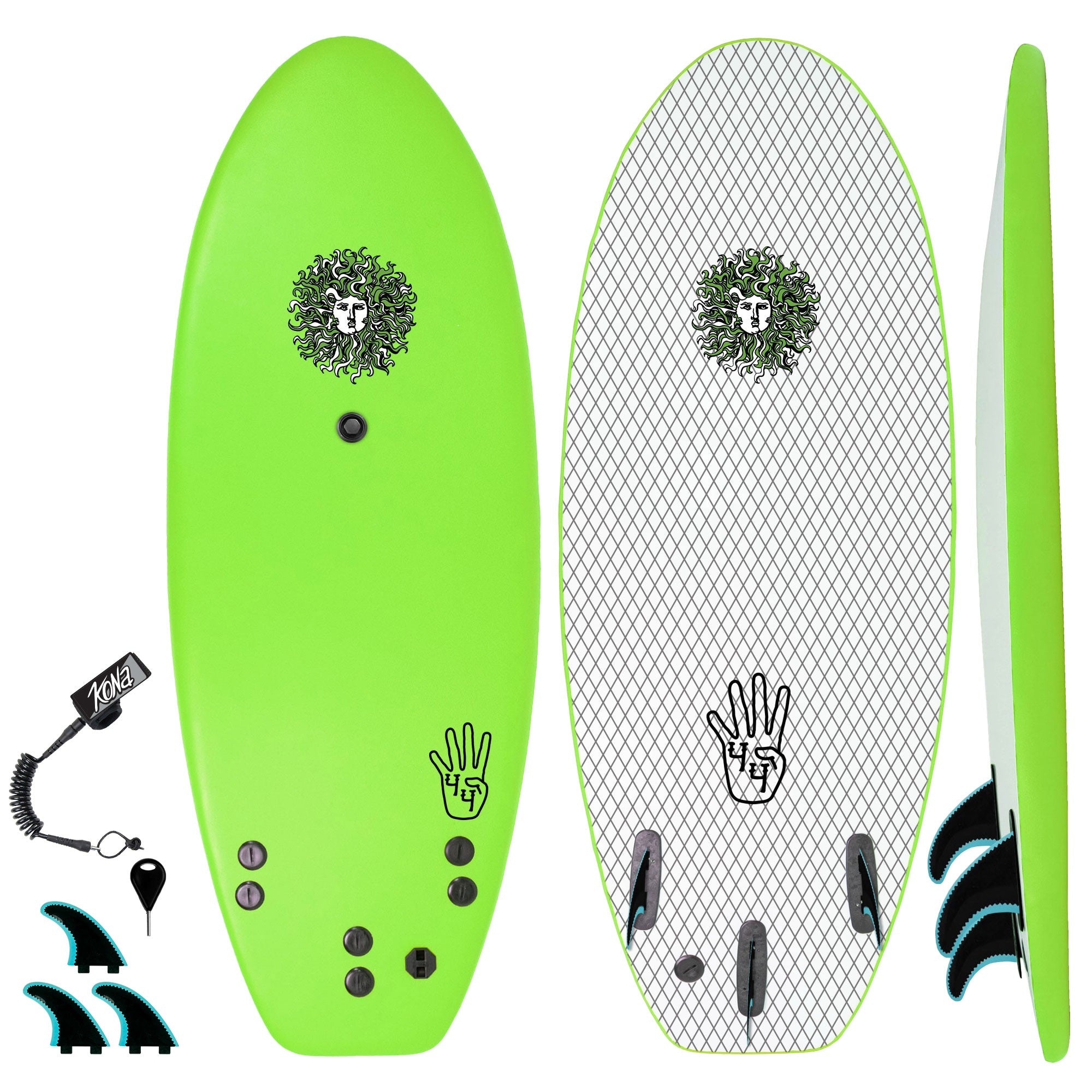 The 4-4 Soft Top Short Foam Surfboard for Beginners and Kids - Includes Leash + Fins