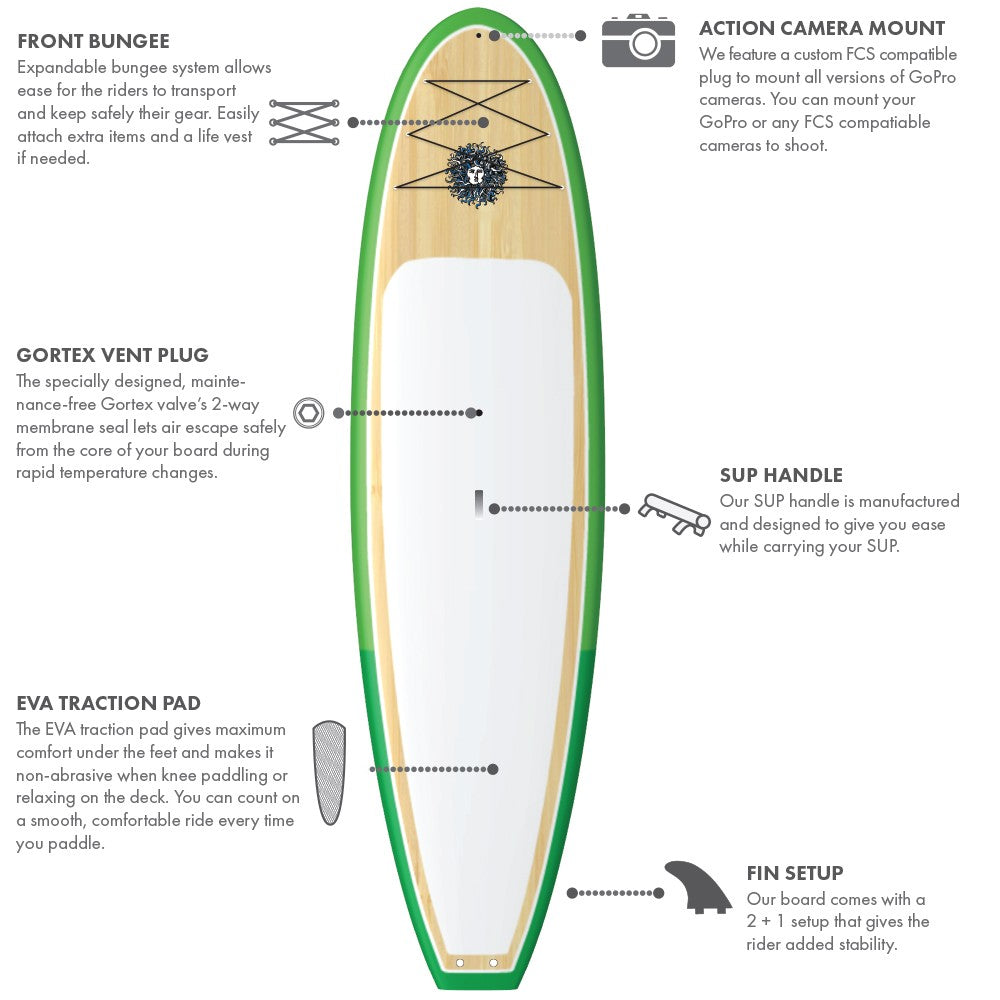 The comprehensive package includes an expandable front bungee system, an EVA traction pad, a camera mount, a convenient carrying handle, a classic 2+1 fin setup for added balance, an adjustable 2-piece paddle, and a SUP coiled leash.